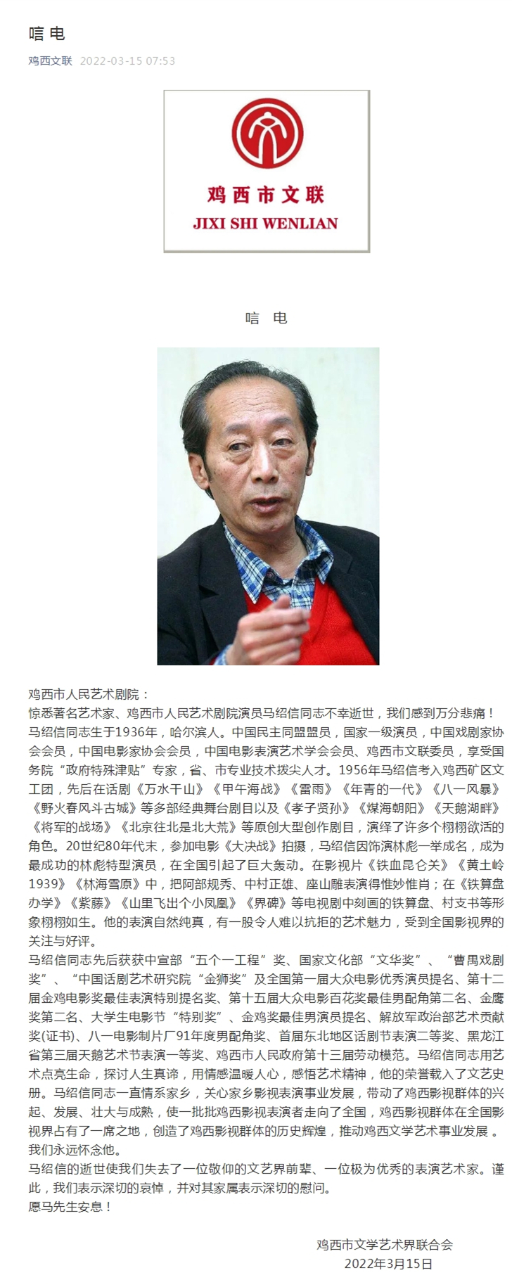 中新網(wǎng)3月16日電 據(jù)“雞西文聯(lián)”微信公眾號消息,著名藝術(shù)家、黑龍江省雞西市人民藝術(shù)劇院演員馬紹信去世,享年86歲。馬紹信是國家一級演員、中國戲劇家協(xié)會會員、中國電影家協(xié)會會員,曾參與電影《大決戰(zhàn)》拍攝,一舉成名。其代表作還包括《林海雪原》《鐵血昆侖關(guān)》等。
