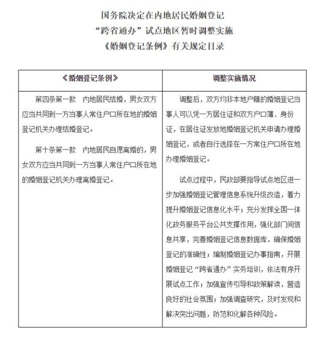 在試點地區(qū),相應暫時調整實施《婚姻登記條例》第四條第一款、第十條第一款的有關規(guī)定(目錄附后)。調整后,雙方均非本地戶籍的婚姻登記當事人可以憑一方居住證和雙方戶口簿、身份證,在居住證發(fā)放地婚姻登記機關申請辦理婚姻登記,或者自行選擇在一方常住戶口所在地辦理婚姻登記。