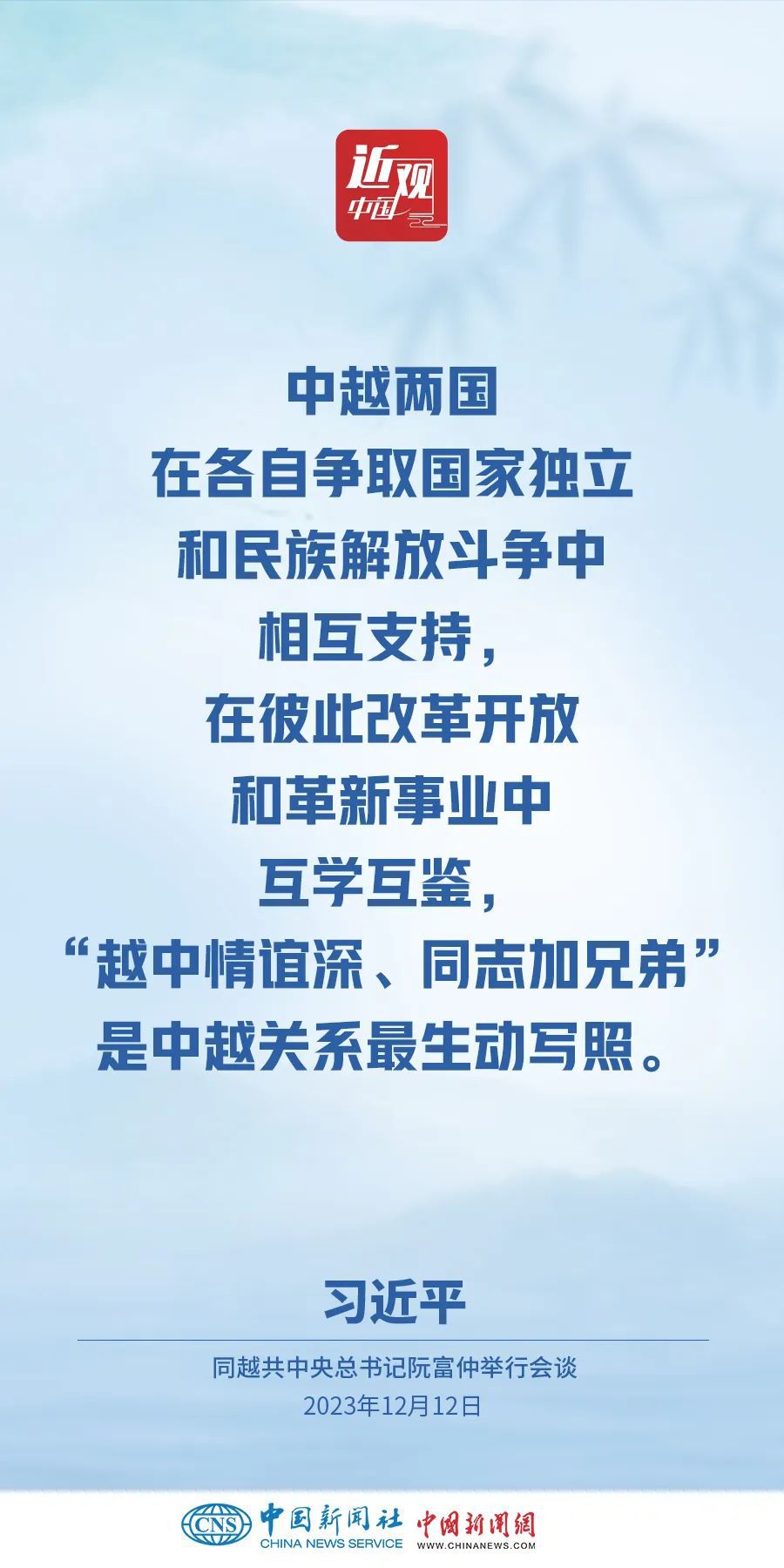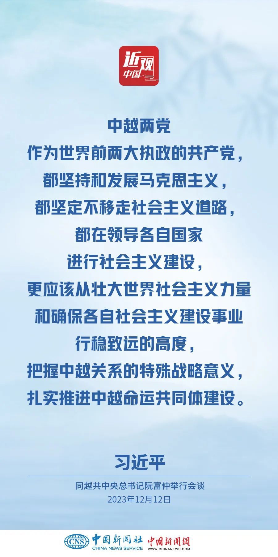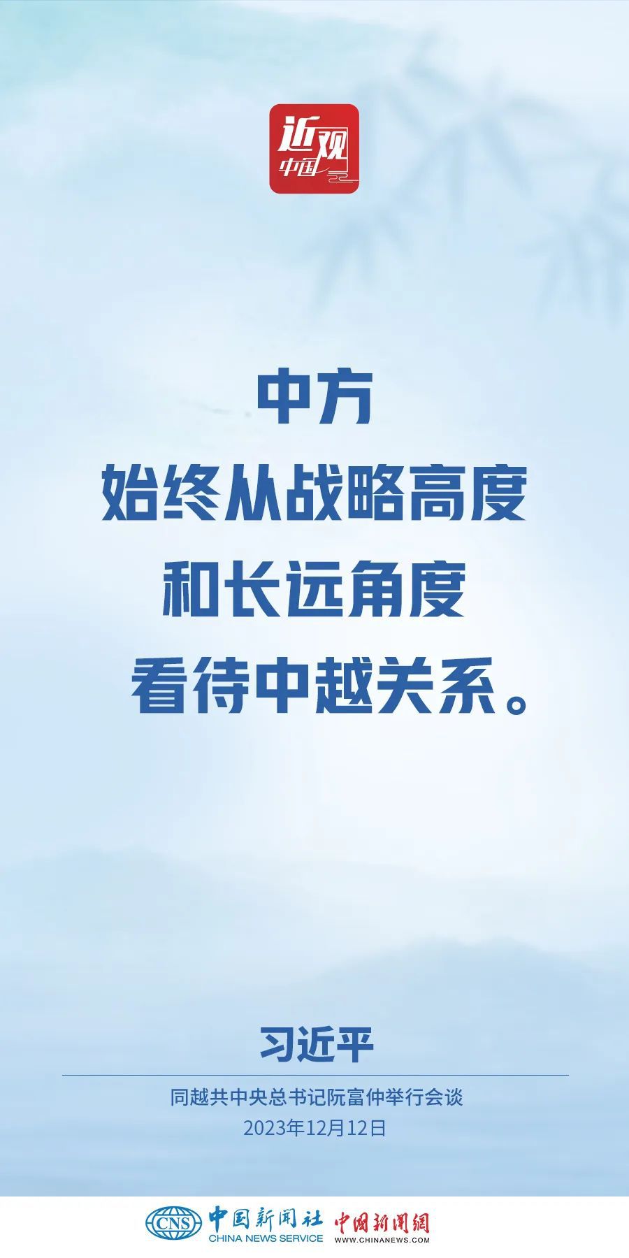 當(dāng)?shù)貢r間12月12日下午,剛剛抵達河內(nèi)的中共中央總書記、國家主席習(xí)近平在越共中央駐地同越共中央總書記阮富仲舉行會談。雙方宣布中越兩黨兩國關(guān)系新定位,在深化中越全面戰(zhàn)略合作伙伴關(guān)系基礎(chǔ)上,攜手構(gòu)建具有戰(zhàn)略意義的中越命運共同體。習(xí)近平指出——