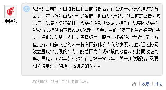 對于上述收購,中國國航于7月5日在投資者互動平臺回應(yīng)稱,公司控股山航集團和山航股份后,正在進一步研究通過多方面協(xié)同安排促進山航股份的發(fā)展。