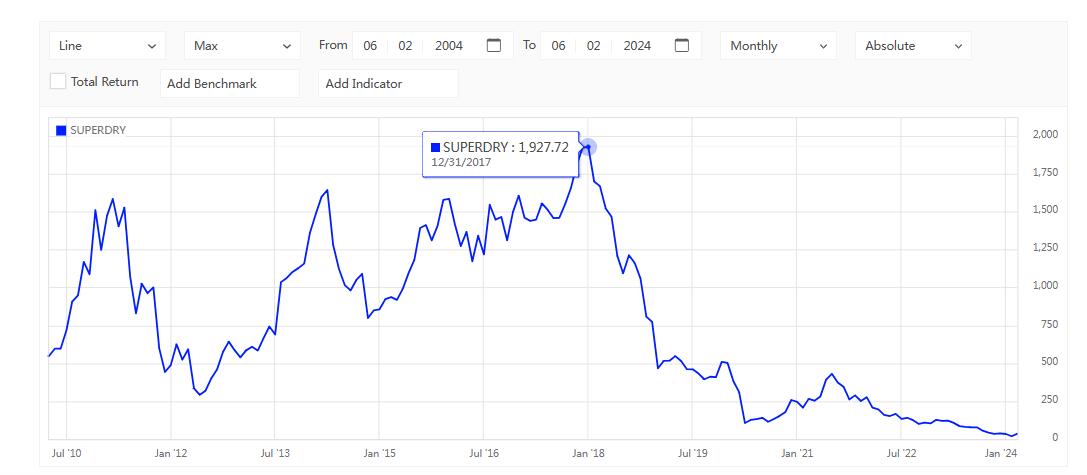 值得一提的是,倫敦證券交易所網(wǎng)站顯示,Superdry的股價(jià)曾在2017年年底達(dá)到過(guò)1927.72便士/股。
