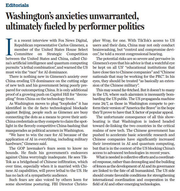 吉門尼斯擺出一副對中國科技迅速發(fā)展憂心忡忡的樣子,這在華盛頓并不新鮮,是國會山反華政客為一己之私推動在科技脫鉤、破壞國際科技合作的又一例證。