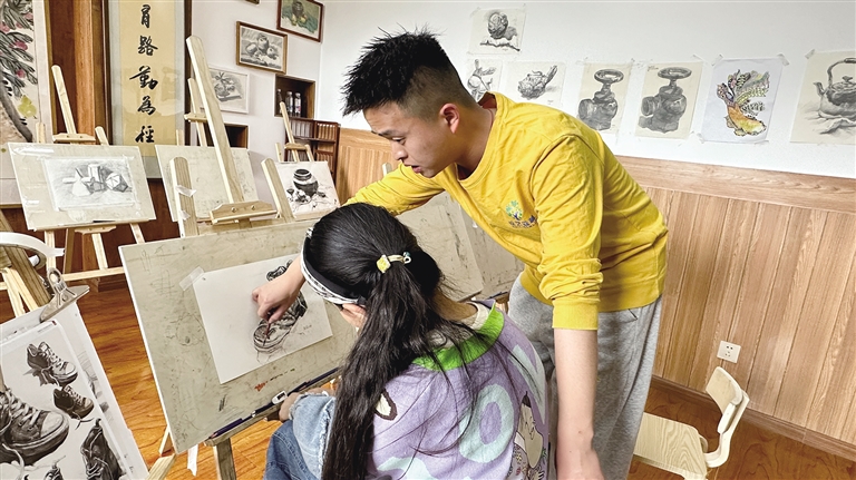 “‘西瓜老師’,這個面包是我特意帶給你的,你餓的時候一定吃。”“‘西瓜老師’,你看我今天畫得怎么樣?有沒有進步?”“‘西瓜老師’,這個地方我不會畫,你能不能教教我?”……課余時間里,陳寶佳經(jīng)常和孩子們一起玩耍,慢慢就成為了孩子們的好朋友。陳寶佳說:“雖然平時會和他們在一起說說笑笑,但是上課的時候我還是比較嚴(yán)厲的。我主要帶素描課,要引導(dǎo)孩子們打好繪畫基礎(chǔ)、練好基本功,今后他們才能在繪畫方面有更多的發(fā)展??吹胶⒆觽儺嫯嬘羞M步的時候,我會覺得很幸福?!?/p>
