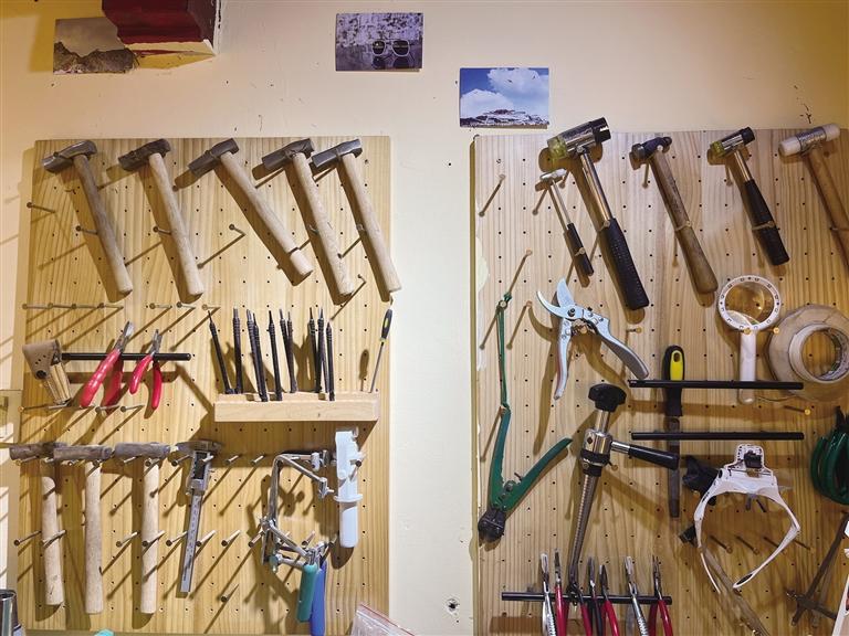 步入堯西平康古建大院,陽光灑落,透過蘋果樹與核桃樹的葉縫,投下片片陰涼,在樹下落座,幽思與怡然不禁飄然而至。耳邊偶爾會傳來陣陣“叮叮當(dāng)當(dāng)”清脆悅耳的敲打聲。聲音源自物喜手工工作室,工作室主理人是42歲的霍志勇,一位將激情與心血全部傾注在打銀工藝中的匠人。霍志勇旅居西藏12年,自2018年在云南學(xué)習(xí)了銀飾制作技藝后,便回到拉薩致力于探索當(dāng)代元素與傳統(tǒng)藏式風(fēng)格結(jié)合的手工銀飾制作。
