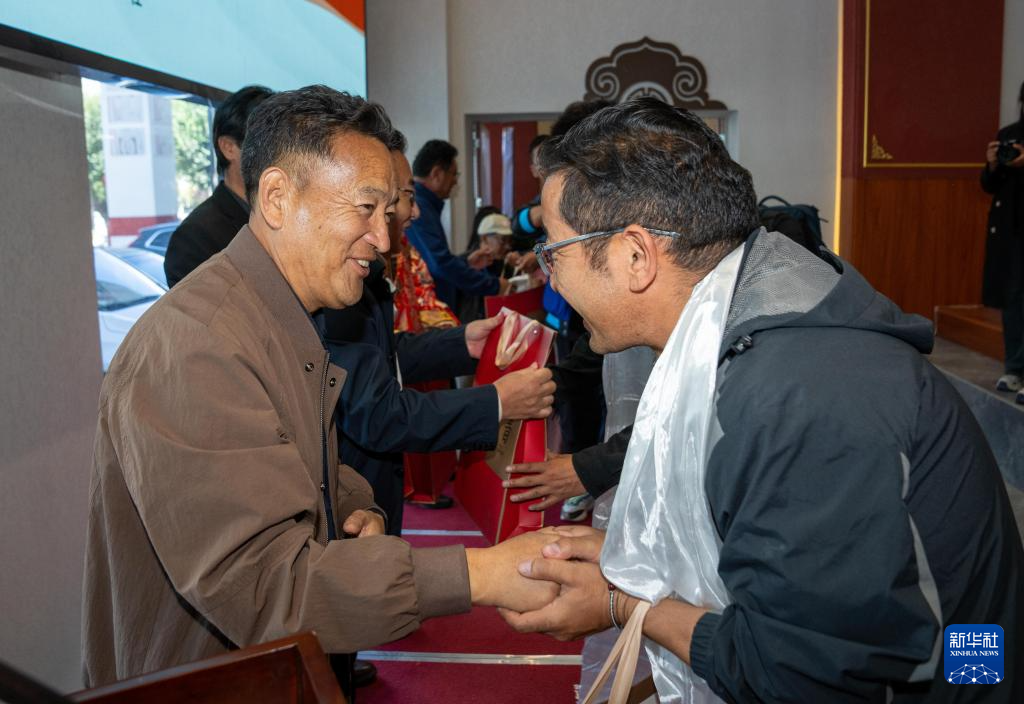 9月13日,參會專家向《格薩爾王傳》系列叢書編輯人員敬獻哈達。新華社記者 旦增尼瑪曲珠 攝