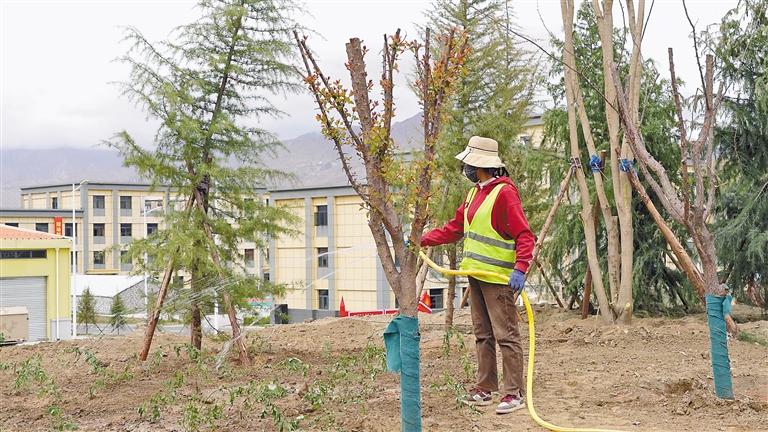 拉薩云天湖公園北側(cè),工人在給樹(shù)苗澆水。