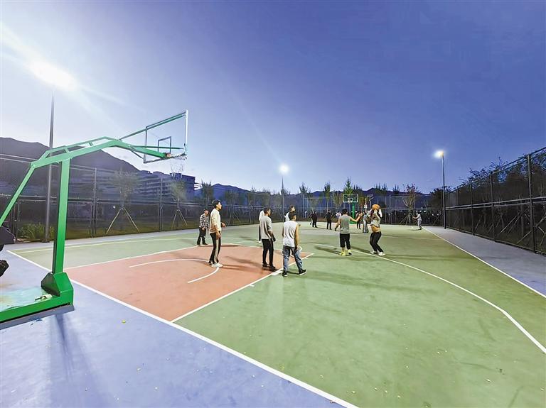 晚上,人們?cè)诶_云天湖公園中心籃球場(chǎng)打籃球。