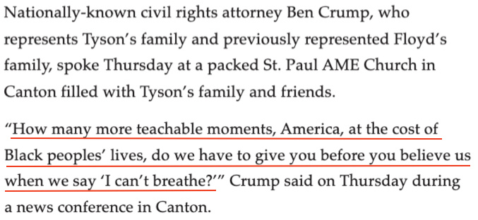 有美媒提到 ,泰森和弗洛伊德都是在遭到警察用膝蓋跪壓后死亡的,而且兩人的最后一句話都是“我無法呼吸”。