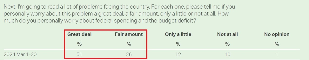 美國民意調(diào)查機構(gòu)蓋洛普公司今年進行的一份關(guān)于美國聯(lián)邦債務(wù)的調(diào)查結(jié)果顯示,對聯(lián)邦債務(wù)問題感到“非常擔心”和“嚴重擔心”的受訪者達到77%。