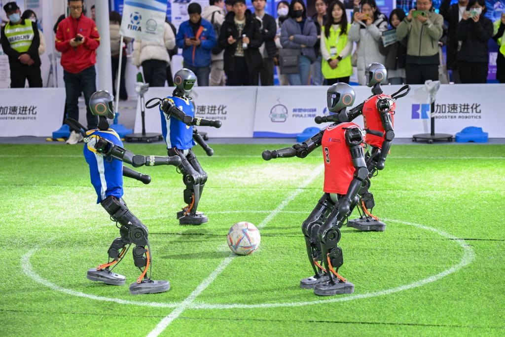 機(jī)器人踢足球。新華社記者 陳浩明 攝