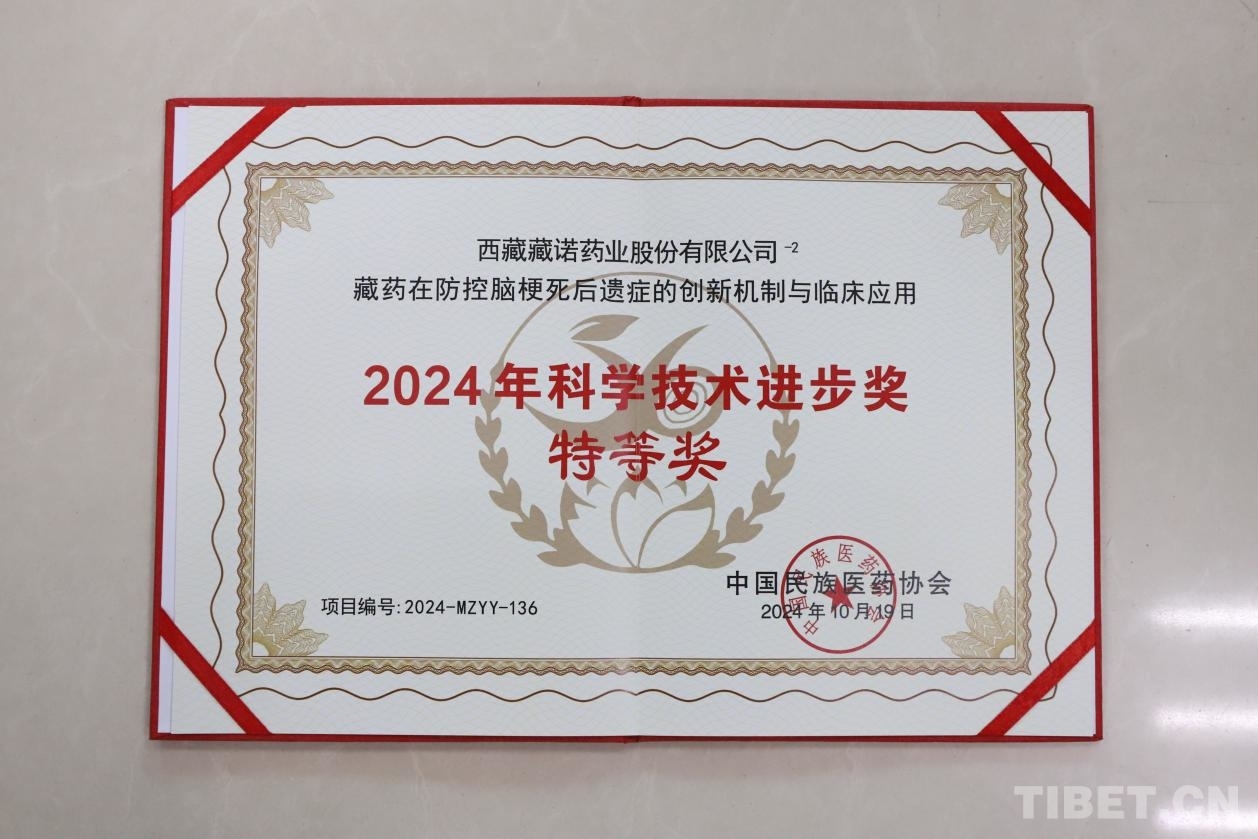 經(jīng)過申報、內(nèi)審和組織有院士、國醫(yī)大師等各民族專家組成的專家委員會初評、終評、公示、報備等環(huán)節(jié)和程序,由河北醫(yī)科大學(xué)第二醫(yī)院、西藏藏諾藥業(yè)股份有限公司、石家莊藏諾藥業(yè)股份有限公司聯(lián)合申報的《藏藥在防控腦梗死后遺癥的創(chuàng)新機(jī)制與臨床應(yīng)用》被授予“2024年中國民族醫(yī)藥協(xié)會科學(xué)技術(shù)進(jìn)步獎”特等獎。