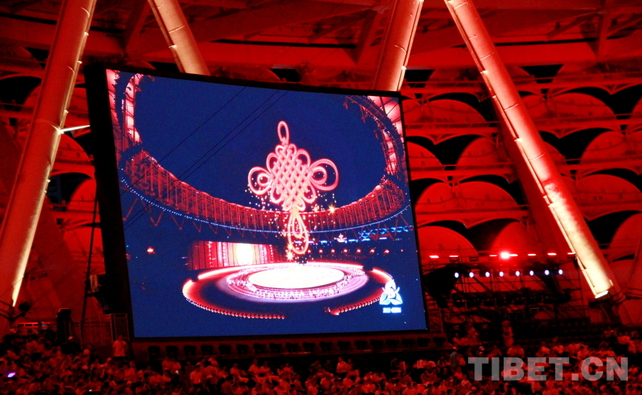 圖為第十二屆全國少數(shù)民族傳統(tǒng)體育運(yùn)動會開幕式上以高科技方式呈現(xiàn)的中國結(jié) 攝影:劉莉