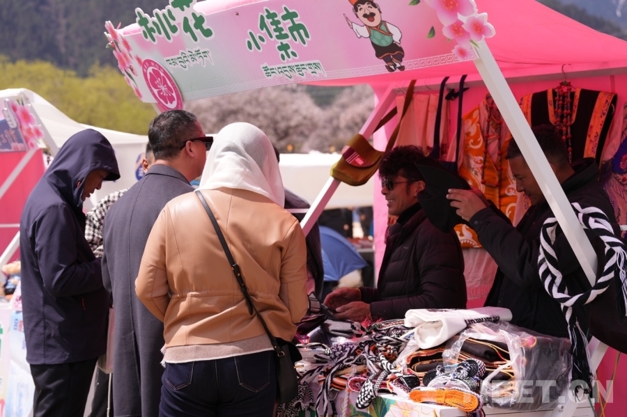 沿著蜿蜒的小路,一邊是錯(cuò)落有致的桃花樹,一邊是特色集市。“這些是工布男女服飾、這是馬套、這是藏式包包……都是我們合作社的工作人員手工制作的?!痹谖枧_一旁的桃花小集市,林芝市巴宜區(qū)絲綢藏裝定制農(nóng)牧民專業(yè)合作社負(fù)責(zé)人尼瑪扎西正向游客一一介紹自家展銷點(diǎn)的產(chǎn)品以及其背后的文化和制作過程。經(jīng)過一番討價(jià)還價(jià),一千余元的“大單子”順利成交,游客將一件件精美的巴宜“小禮品”裝進(jìn)袋子和尼瑪扎西揮手告別。