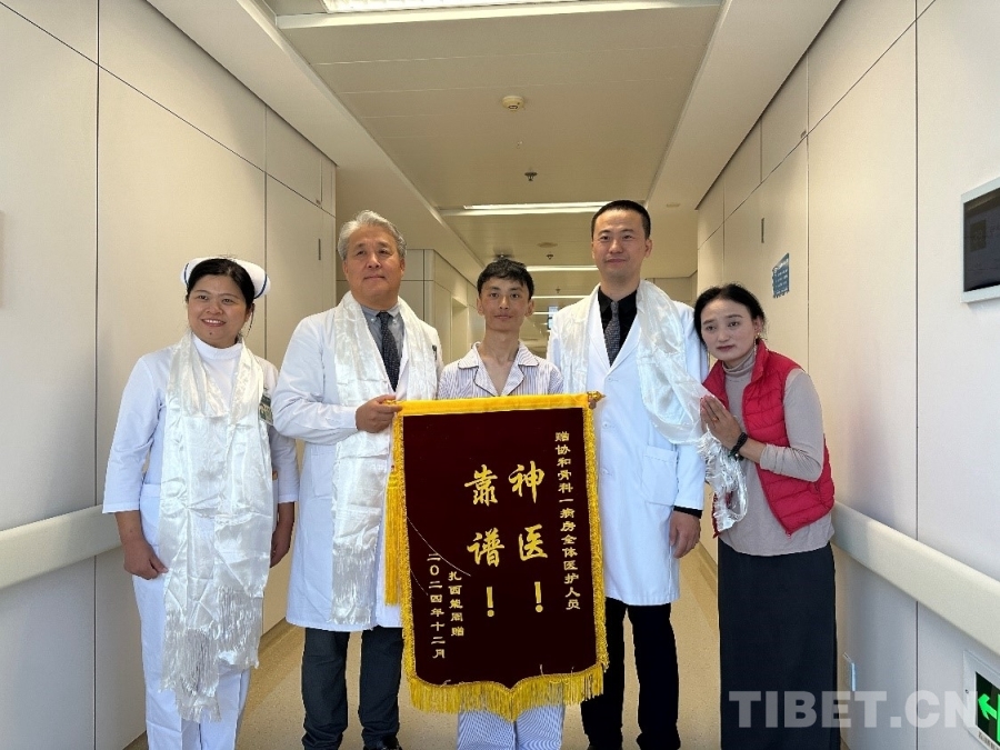 圖為受到救助的藏族患者向北京協(xié)和醫(yī)院骨科醫(yī)療團隊贈送錦旗 攝影:楊眉笑