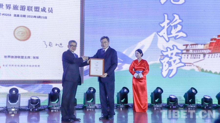 圖為世界旅游聯(lián)盟向拉薩市頒發(fā)世界旅游聯(lián)盟會(huì)員證書