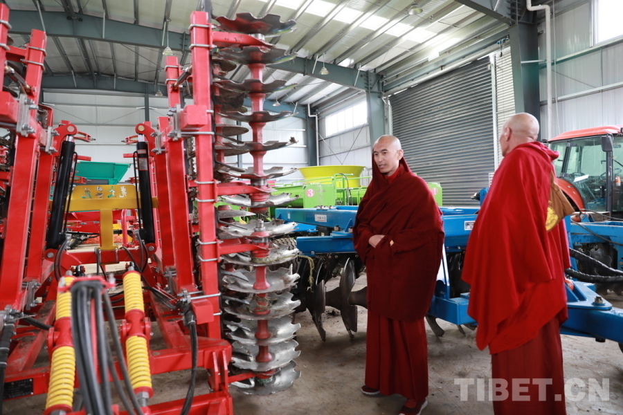 圖為甘孜縣甘孜寺的僧人江陽克珠(左)正在觀察大型現(xiàn)代化農(nóng)業(yè)機(jī)械 攝影:劉莉