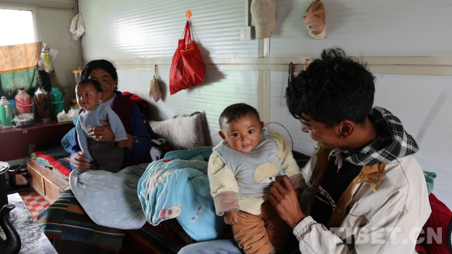 圖為旦增點旦回到板房照看小孩