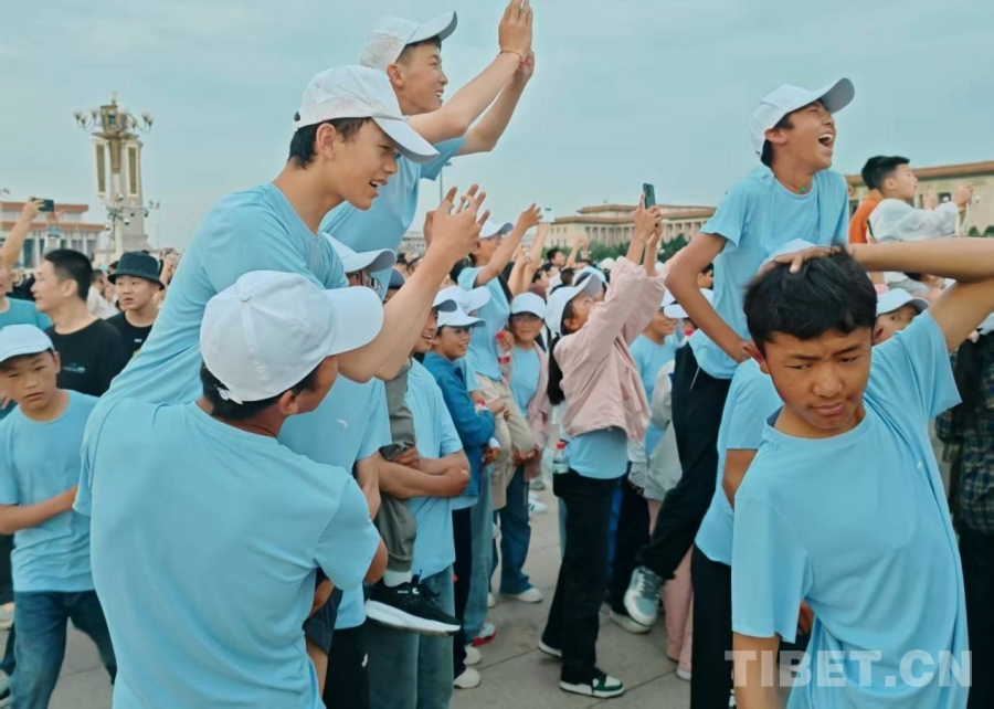 圖為參加“山河同脈·京華筑夢(mèng)”研學(xué)活動(dòng)的西藏日喀則定日縣中學(xué)生們?cè)谔彀查T廣場(chǎng) 攝影:張?jiān)?/p>