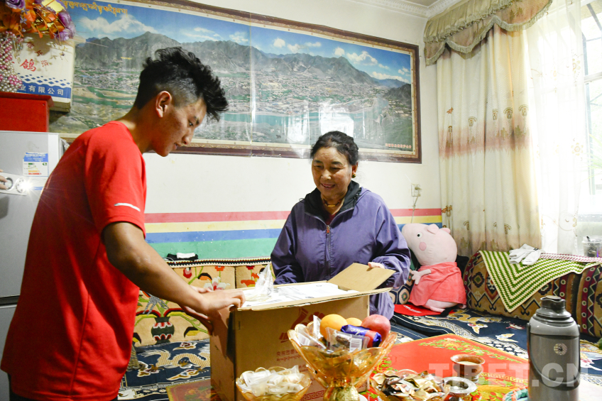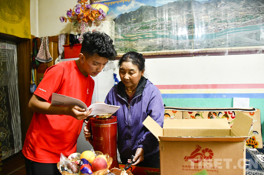 圖為卓嘎與兒子羅布次仁一起鄭重打開中央代表團(tuán)贈送的全自動酥油茶壺包裝 攝影:趙振宇