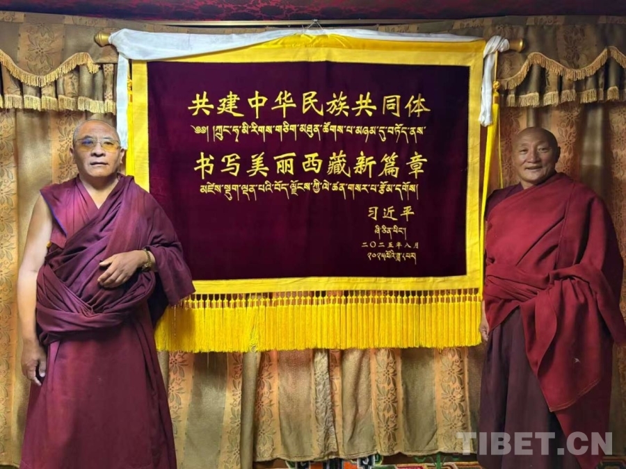 中央代表團(tuán)向孝登寺贈(zèng)送了習(xí)近平總書記題詞的“共建中華民族共同體 書寫美麗西藏新篇章”賀幛。土登對(duì)此深有感觸:“‘共建中華民族共同體’意味著56個(gè)民族共同致力于中華民族的偉大夢(mèng)想;‘書寫美麗西藏新篇章’是指西藏從1965至今發(fā)生巨變,我們正在此基礎(chǔ)上創(chuàng)造更美好的未來。”