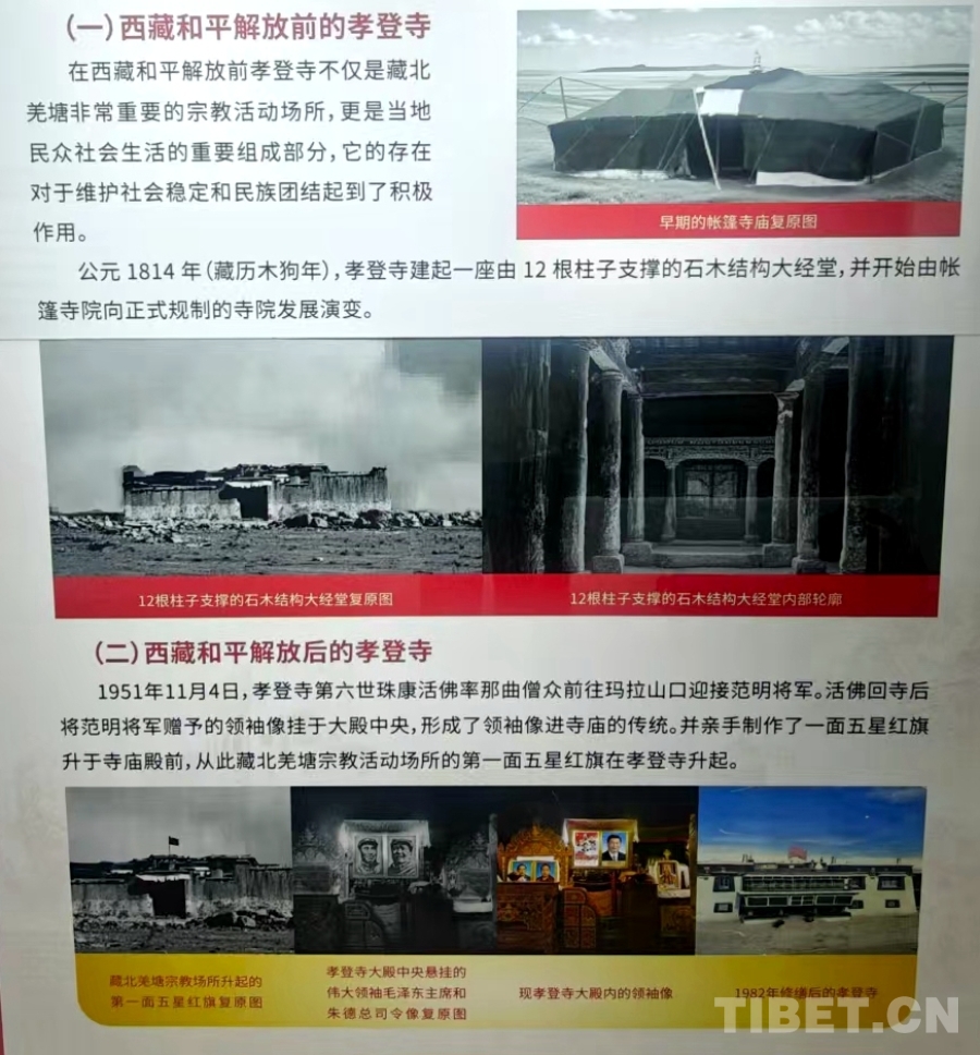 走進(jìn)孝登寺,主殿正中央懸掛的領(lǐng)袖像莊嚴(yán)醒目。據(jù)孝登寺管委會(huì)副書記、主任羅布旺秋介紹,1951年,范明將軍率解放軍途經(jīng)那曲時(shí),六世珠康活佛力排眾議前往馬拉山迎接。范明將軍向僧眾宣講黨的民族宗教政策,并向六世珠康活佛贈(zèng)送了毛主席和朱總司令畫像。此后,六世珠康活佛將領(lǐng)袖像敬懸于大殿正中,這一傳統(tǒng)延續(xù)至今。他還親手制作并升起了藏北寺廟中的第一面五星紅旗。