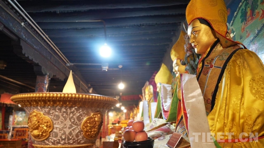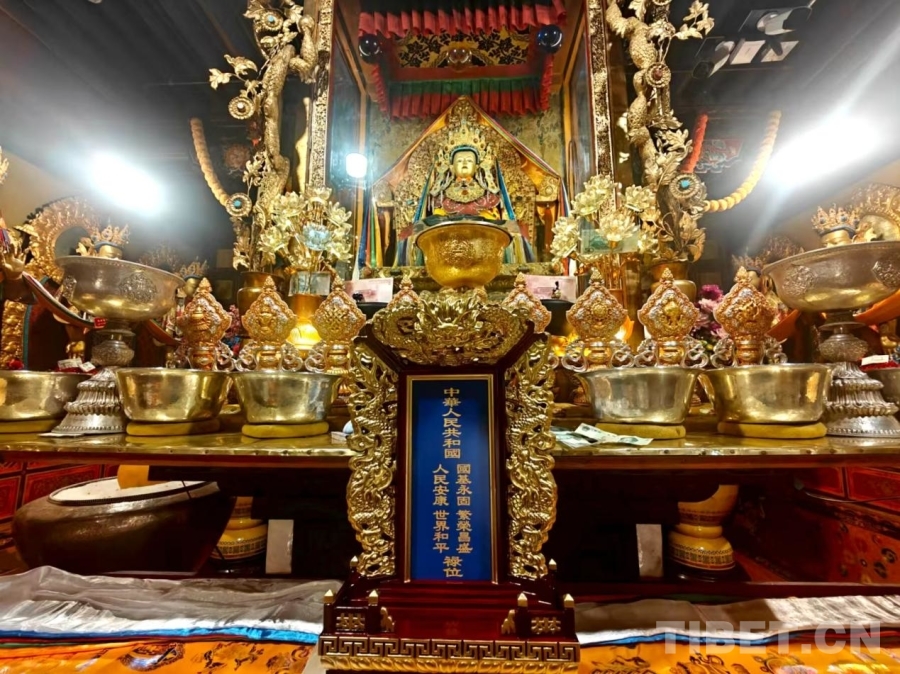 圖為孝登寺主供佛——釋迦牟尼佛像,以及前方擺放的該寺為慶祝西藏自治區(qū)成立60周年而特別制作的祿位