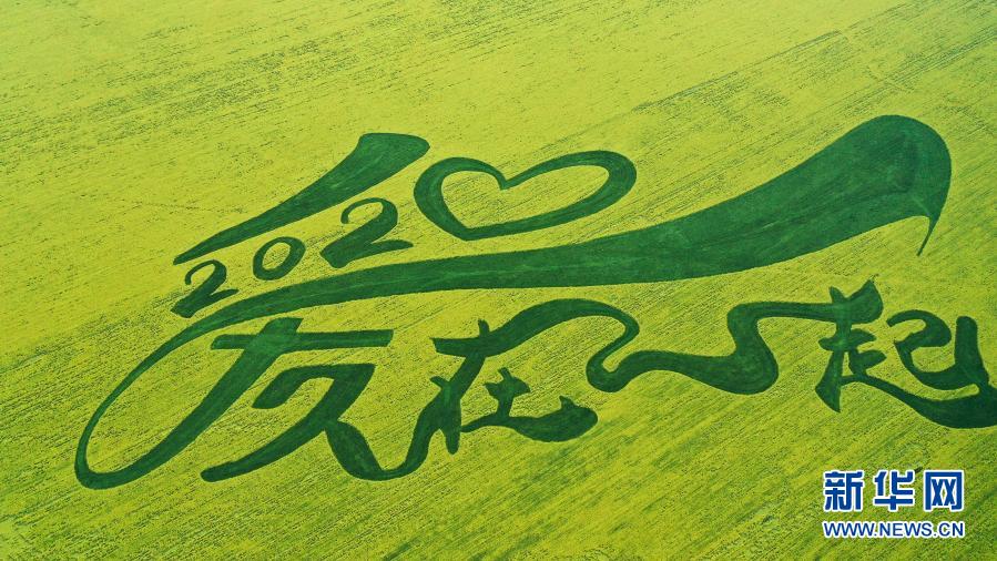 這是7月23日拍攝的青海門(mén)源回族自治縣的油菜花田拼出的“2020愛(ài)在一起”的圖案(無(wú)人機(jī)照片)。新華社記者 吳剛 攝