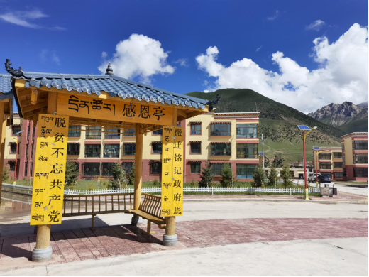 群山連綿、江河蜿蜒,雜花生樹、綠草如茵,距離縣城3公里,“牧人希望家園”靜靜矗立在瀾滄江源頭。走進(jìn)大門,小區(qū)內(nèi)寬敞的廣場,配套設(shè)施齊全,刻著“感恩”紅色大字的石頭擺放在中央,還專門設(shè)有“感恩亭”,老人孩童,坐在一排排白墻紅瓦藏式風(fēng)格濃郁的三層小樓臺(tái)階上納涼,一派歡樂祥和景象。這里是海拔4200米青海玉樹藏族自治州雜多縣的一個(gè)易地扶貧搬遷安置點(diǎn)。我們今天走訪的對(duì)象是蘇魯鄉(xiāng)山榮村的東尕和巴宗。