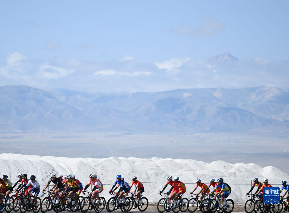 8月1日,參賽選手在第六賽段——茶卡壹號·鹽湖景區(qū)至都蘭的比賽中騎行。新華社記者 張龍 攝
