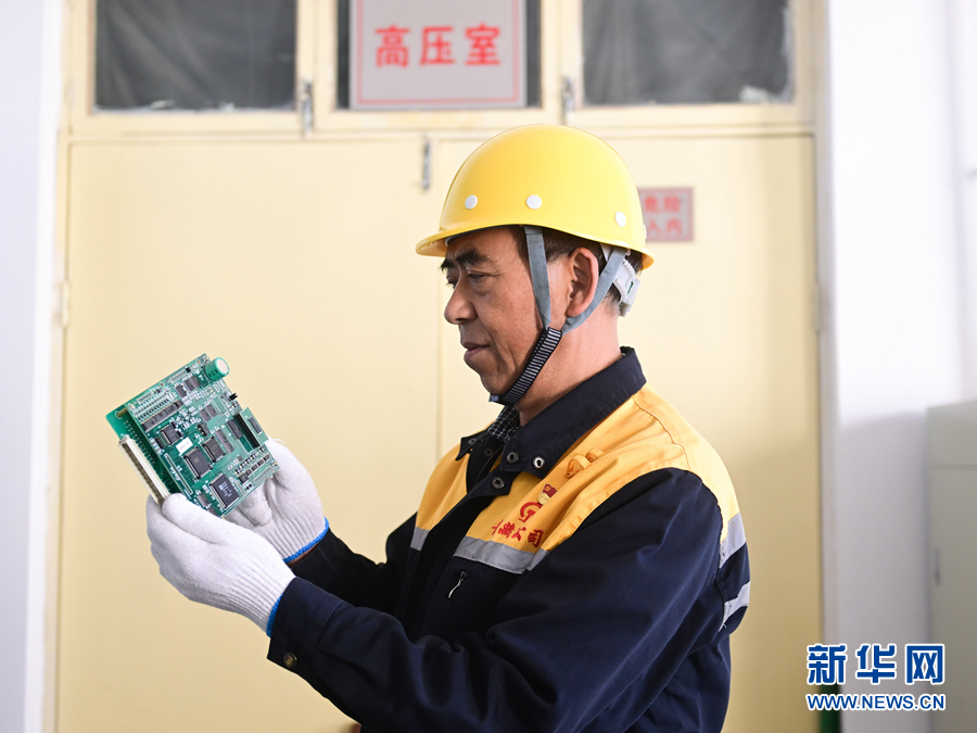 2月5日,在青藏集團(tuán)有限公司西寧供電段格爾木檢修車(chē)間,王永忠在查看一塊電路板是否有故障。新華社記者 張龍 攝