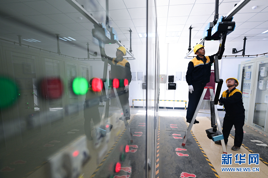 2月5日,在青藏集團(tuán)有限公司西寧供電段格爾木檢修車(chē)間,王永忠與同事在巡檢保護(hù)裝置柜。新華社記者 張龍 攝