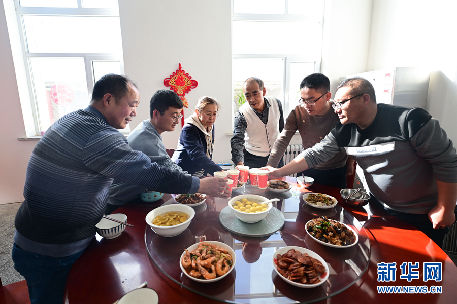 2月5日,在青藏集團(tuán)有限公司西寧供電段格爾木檢修車(chē)間,王永忠與同事們舉杯慶祝元宵節(jié)。新華社記者 張龍 攝