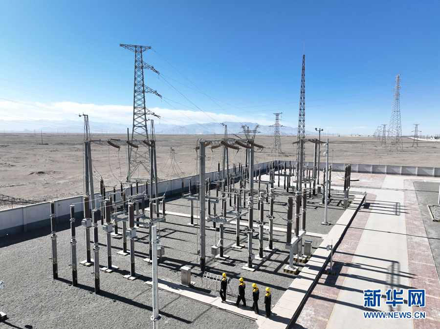 2月5日,在青藏集團(tuán)有限公司西寧供電段格爾木南變電所,王永忠(左一)與同事們?cè)谘矙z(無(wú)人機(jī)照片)。新華社記者 張龍 攝