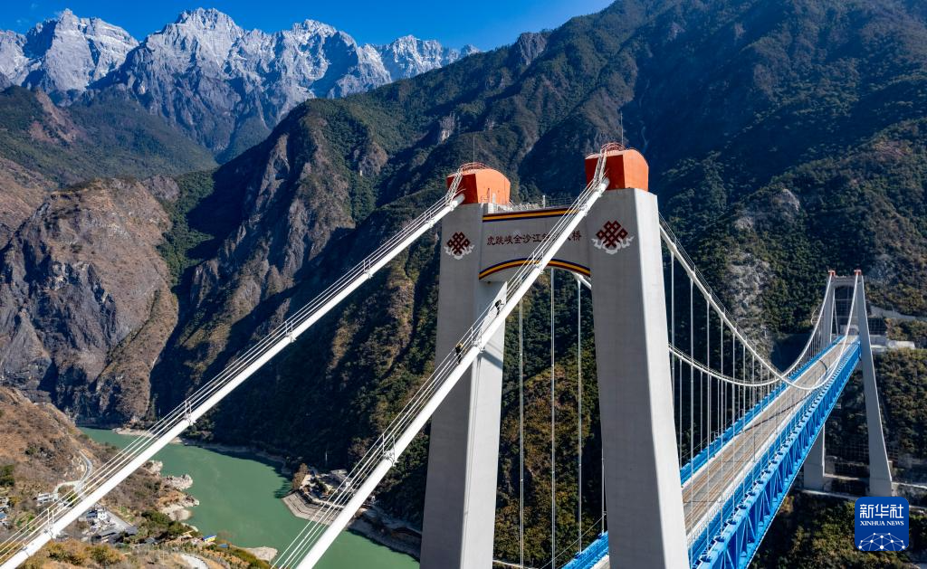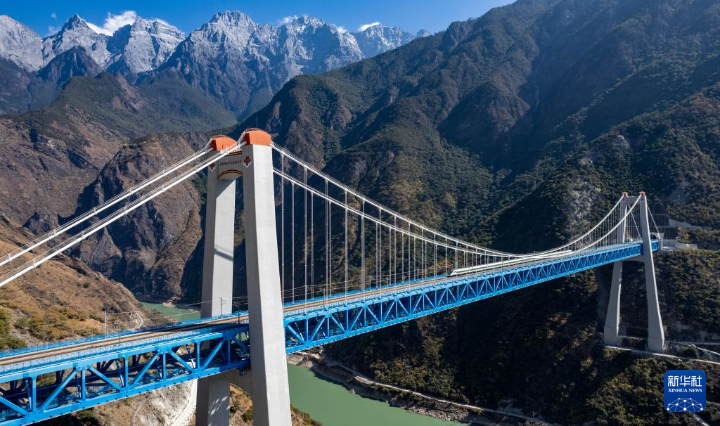 虎跳峽金沙江鐵路大橋位于云南麗江與香格里拉交界處的虎跳峽景區(qū),橫跨金沙江,全長(zhǎng)882.5米,主跨達(dá)660米,橋面離江面垂直距離約250米,大橋兩端分別與玉龍雪山隧道和哈巴雪山隧道連接,是麗香鐵路重點(diǎn)控制性工程。