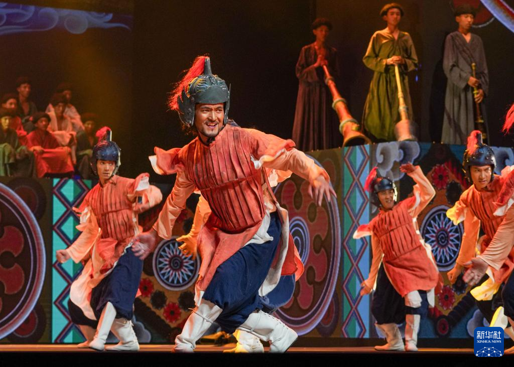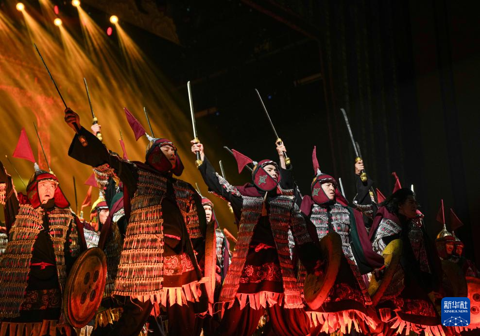 7月19日,在西藏拉薩《緣起象雄·古格遺風(fēng)》情景歌舞詩演出現(xiàn)場,演員在表演節(jié)目《勇士戰(zhàn)舞》。新華社發(fā)(格桑雍珍 攝) ??