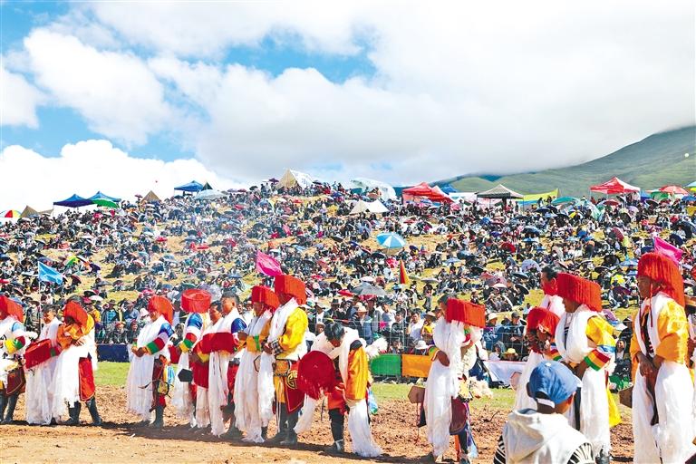 在邊交林鄉(xiāng)當杰村“望果節(jié)”活動現場,隨著激昂的《運動員進行曲》,當杰村“平措林望果節(jié)”活動拉開帷幕,38名馬術運動員、38名射箭運動員在2萬多名觀眾的歡呼聲中邁入現場。