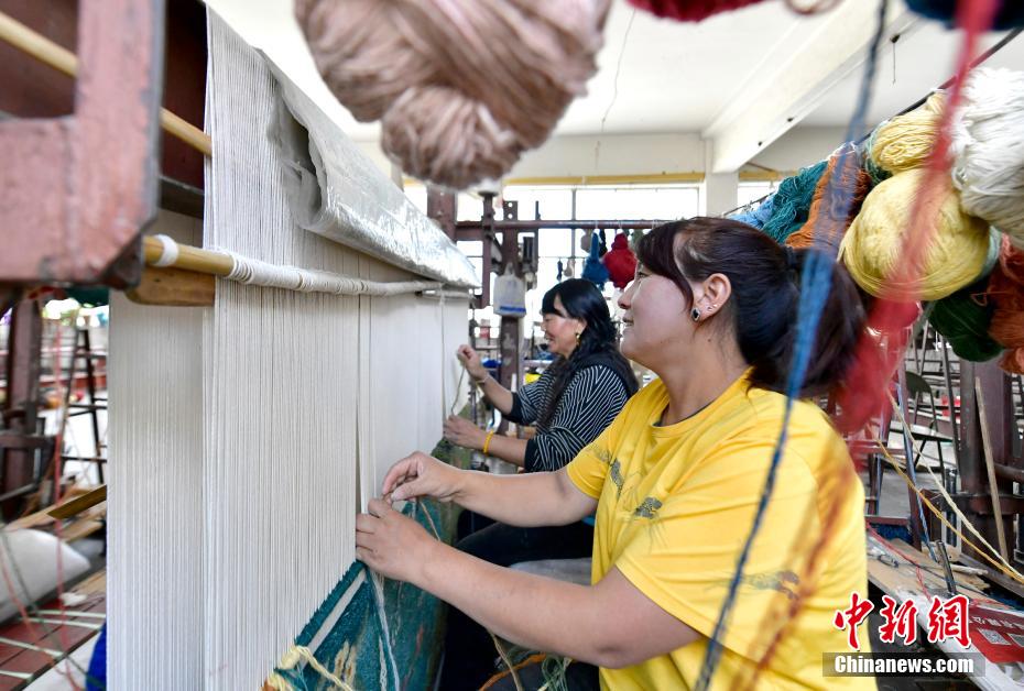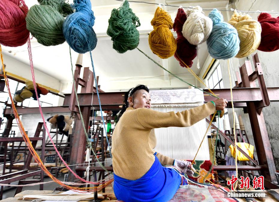 藏毯是世界三大名毯之一,以艷麗的色彩、濃厚的民族風格、鮮明的地域特色聞名遐邇。圖為8月16日,西藏拉薩的一家藏毯廠里,巧手的工人們用傳統(tǒng)藏式手工打結法將五顏六色的羊毛線編織成圖案精美的藏毯。中新社記者 李林 攝