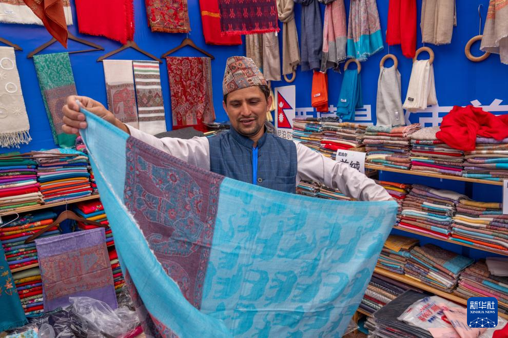 來自尼泊爾的商人蘇雷什·達(dá)卡爾在介紹他的披肩(8月19日攝)。新華社記者 旦增尼瑪曲珠 攝