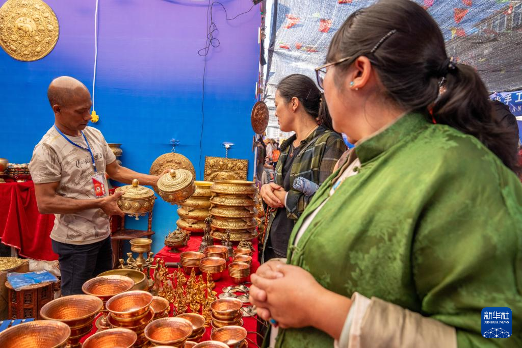 來自尼泊爾的商人阿曼向顧客展示商品(8月19日攝)。新華社記者 旦增尼瑪曲珠 攝 ??