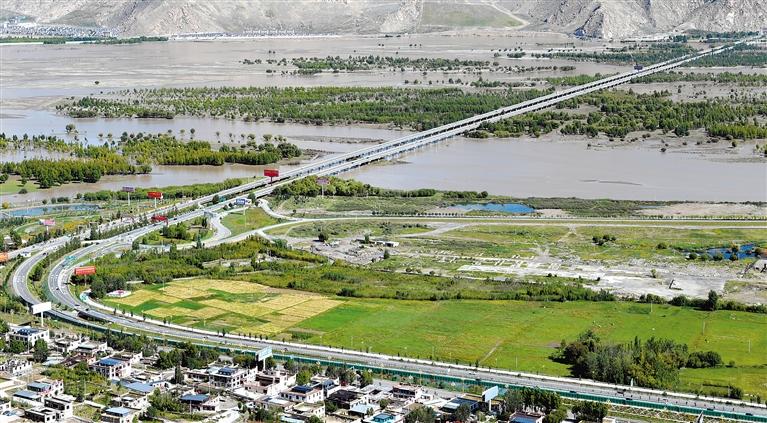 圖為鳥瞰雅魯藏布江上的雅江特大橋。 記者 旦增蘭澤 攝