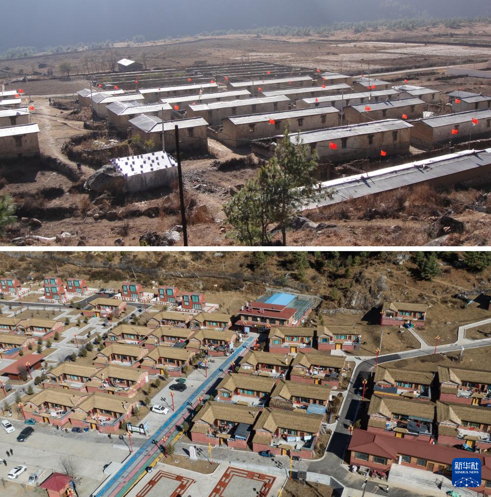 拼版照片,上圖為:2005年拍攝的達(dá)曼新村(新華社發(fā));下圖為:2024年12月15日拍攝的達(dá)曼新村(無人機(jī)照片,新華社記者丁增尼達(dá)攝)。新華社發(fā) ??
