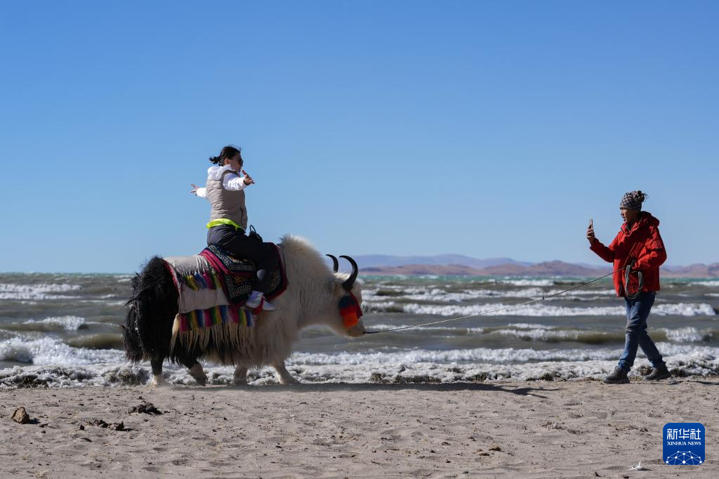 游客在納木錯(cuò)湖畔拍照留念(12月11日攝)。新華社記者 丁汀 攝