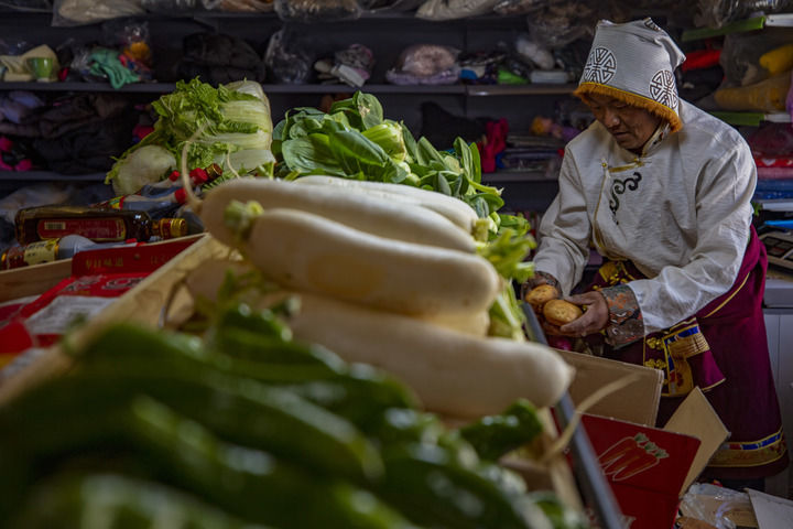 在西藏那曲市申扎縣馬躍鄉(xiāng)貝嘎四村偏遠(yuǎn)鄉(xiāng)鎮(zhèn)果蔬配送試點(diǎn)項(xiàng)目直銷點(diǎn),店主西熱加措在整理供銷合作社配送來的新鮮蔬菜(2024年1月5日攝)。新華社記者 姜帆 攝