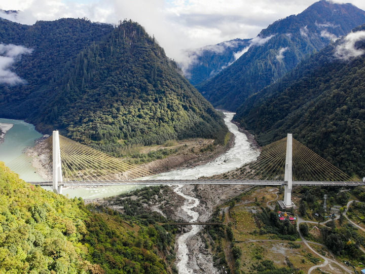 2019年10月27日拍攝的川藏公路通麥路段上的迫龍溝特大橋(無人機(jī)照片)。迫龍溝特大橋位于西藏林芝市波密縣境內(nèi),是西藏自治區(qū)內(nèi)最大的公路雙塔斜拉橋。新華社記者 孫非 攝
