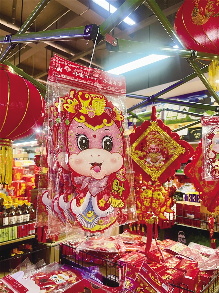 在永輝、百益等商超里,新年的氛圍同樣濃厚。超市入口處最顯眼的位置掛出了紅艷艷的對(duì)聯(lián)、燈籠、錦鯉小掛飾、金蛇送福貼紙等新春飾品,供顧客們選購(gòu)。這些春聯(lián)和掛飾價(jià)格在十幾元至幾十元不等,款式豐富,寓意美好,深受人們喜愛(ài)。
