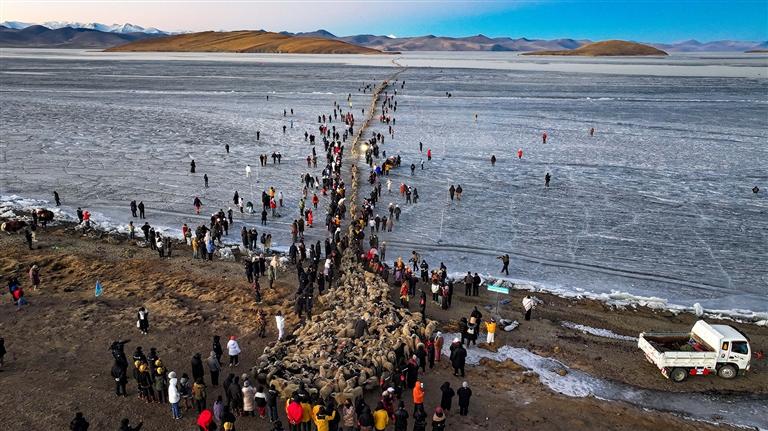 2月7日凌晨,西藏山南市浪卡子縣打隆鎮(zhèn)推瓦村旁的普莫雍措湖面上,夜色未退,一群村民打著手電筒,沿著用牛糞灰鋪就的冰路,穩(wěn)步將數(shù)百只羊趕往湖心島。這一延續(xù)千年的“冰湖趕羊”傳統(tǒng),是當(dāng)?shù)啬撩衽c自然和諧共處的智慧碩果,也承載著普莫雍措獨(dú)特的歷史記憶。在這里,冰面的湛藍(lán)裂紋、牧羊人的質(zhì)樸堅(jiān)守與游客的由衷贊嘆相互交融,共同講述著有關(guān)生存、傳承和敬畏自然的故事?!霸诟篙叀⒆孑吥菚r(shí)候,羊群是村民們賴以生存的根本;如今,趕羊活動(dòng)帶來的旅游熱潮依然是大家維持生計(jì)的重要支撐。所以,我想跟推瓦村的年輕人說,一定不要忘記這項(xiàng)傳統(tǒng),不要舍棄這些給我們帶來富足生活的羊群?!蔽榻鸬┰鰸M懷深情地說道。