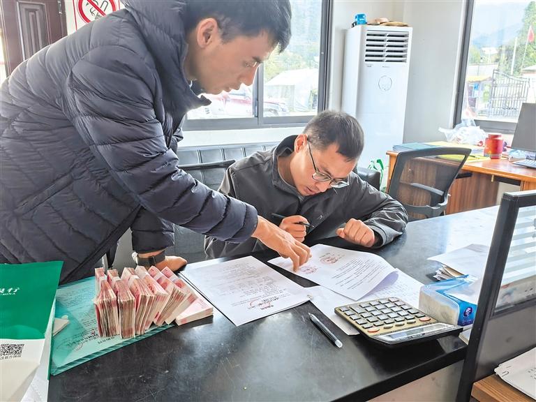 墨脫縣新創(chuàng)農業(yè)科技開發(fā)公司工作人員為波東村種植戶結算靈芝款。