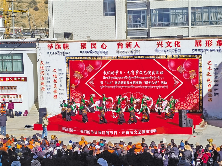 由日喀則市文旅局主辦、日喀則市群眾藝術(shù)館承辦的“我們的節(jié)日·元宵節(jié)文藝演出活動(dòng)暨‘1+3’意識(shí)新時(shí)代文明實(shí)踐‘暖冬六送’活動(dòng)”,在日喀則市群眾藝術(shù)館院內(nèi)舉行?;顒?dòng)在舞蹈《阿吉朗薩》中溫暖開場(chǎng),《歡樂日喀則》《心中的祝?!贰吨袊?guó)夢(mèng)》等節(jié)目掀起了活動(dòng)的高潮,觀眾們手中揮舞的五星紅旗表達(dá)了對(duì)祖國(guó)母親的熱愛之情和對(duì)幸福生活的感恩之情。