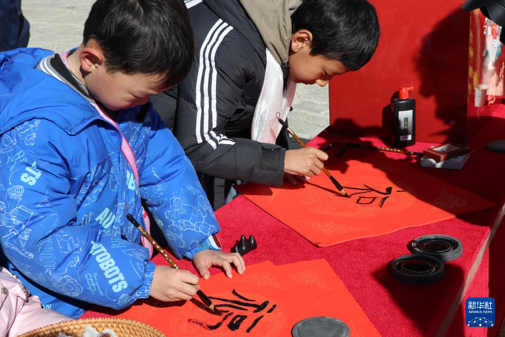 2月12日,楊宸洺(左一)在布達(dá)拉宮珍寶館院內(nèi)的書法區(qū)寫“福”字。(旦增卓瑪 攝)