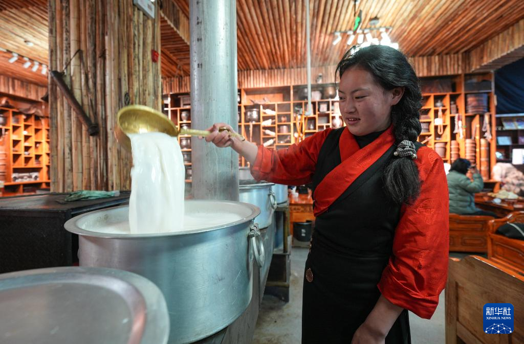 “牧人寶庫(kù)”藏式茶館服務(wù)員在熬制奶茶(2月13日攝)。新華社記者 晉美多吉 攝??